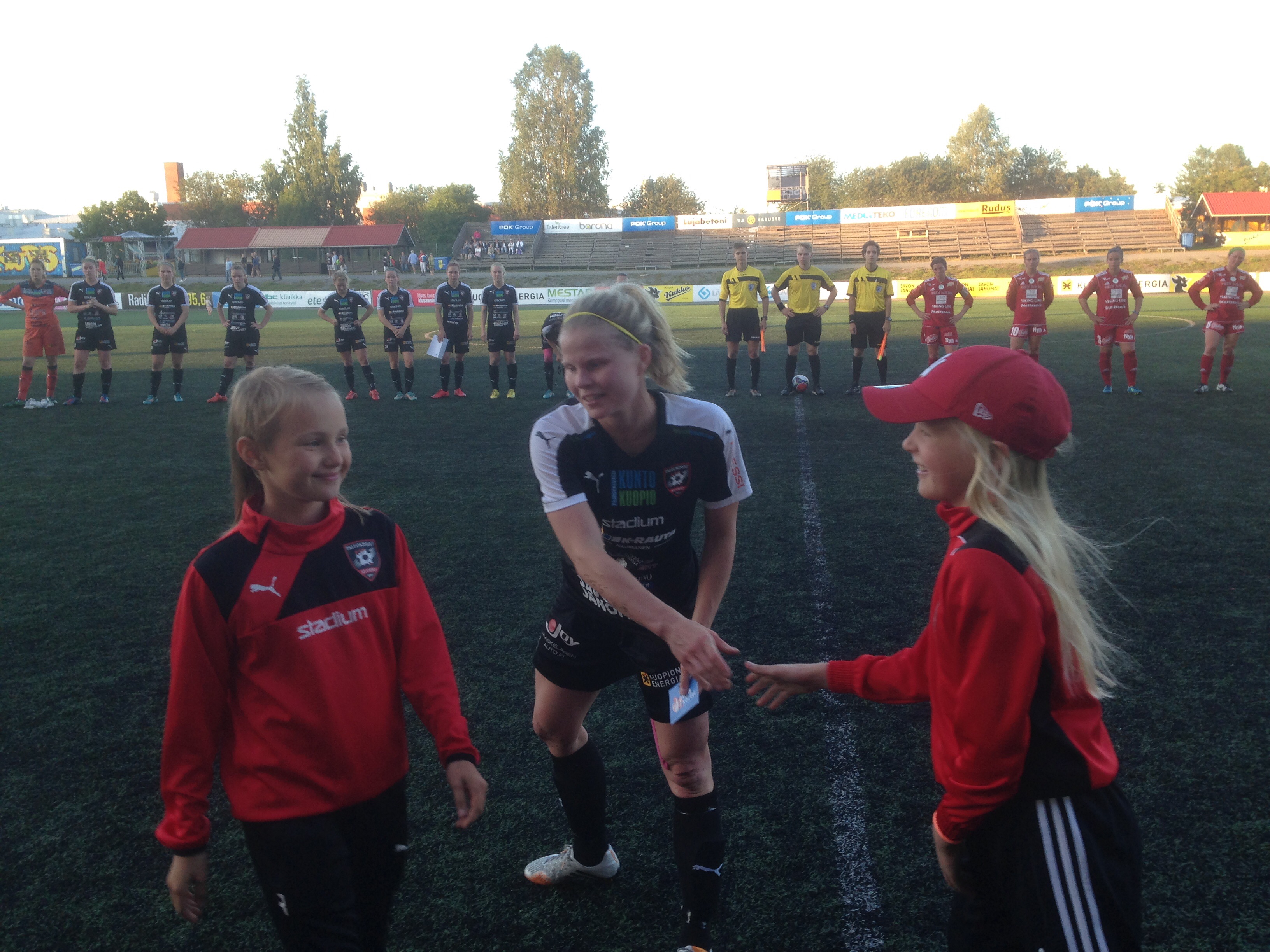Pallokissat katkaisi pienen tappioputkensa kotitasapelillä 2-2 sarjakakkosta Åland Unitedia vastaan. Pallokissat nousi tasoihin aivan viime hetkien tasoituksella. Pallokissat oli käyttänyt kuluneen viikon palauttaen mieliin oman pelitavan ydinasioita ja tulikin otteluun kovalla prässillä. Ensimmäisen kymmenminuuttisen aikana vierailijat olivat vaikeuksissa peliin avaamisessaan ja kotijoukkue sai muutamia riistoja keskialueella ja yhden riiston jälkeen Signy Aarna pääsi murtautumaan vasemmalta läpi, mutta takaviistoon annettu keskitys ei löytänyt omia eikä vieraita. Vierasjoukkueen pelätty ja tehokas Cynthia Uwak pääsi noin viidentoista minuutin pelin jälkeen ensimmäisen kerran nokikkain Pallokissojen maalivahti Pauliina Tähtisen kanssa, mutta Pake hoiti tilanteen. Tämän jälkeen Pallokissoilla oli muutama vaarallinen kulmapotku ja laukaisupaikka, mutta näistä ei tulosta. 24 minuutin pelin jälkeen Tiia Savolainen pääsi omalla laidallaan haastamaan 1v1 tilanteessa puolustajan ja sitten topparin ja pystyi vapauttamaan oman oikean jalkansa noin 15 metrissä ja laukoi komean avausmaalin takayläkulmaan, 1-0. Kymmenen minuuttia myöhemmin vierailijat saavat ensimmäisen puoliajan toisen tilanteensa, kun pitkä ristipallo tavoittaa Uwakin rangaistualueella, mutta löysä pusku on Paken helppo hoitaa. Tätä seurasi kotijoukkueen pitkä pallonhallintajakso, joka päättyy kun Tiia Savolainen murtautuu vasemmalta sisään, löytää pitkällä takaviistopallolla Olga Ahtisen 16 ulkopuolelta. Kaikkien odottaessa Olgan pommia hän löytääkin vielä Signyn rangaistusalueelta, mutta Signyn ohjauksen vieraiden maalivahti Noora Matikainen torjuu kulmaksi. Heti toisen puoliajan alkuun vierailijat saavat kaksi kulmapotkua, mutta sen jälkeen alkaa kotijoukkueen hallitsema 20 minuutin jakso. Kotijoukkueen agressiivinen prässi tuottaa monta riistoa ja syötönkatkoa hyökkäysalueella. Näiden seurauksena lukuisia kulmapotkuja, hyviä kombinaatioita hyökkäyskolmanneksella ja monipuolisia murtautumisyrityksiä ja pari laukausta rangaistusalueen ulkopuolelta, mutta ei maalia. Hyvän jakson jälkeen kotijoukkueen puolustukselle sattuu harmittava syöttövirhe keskiympyrässä. Syötönkatkon seurauksena Uwak karkaa osittain oikealta läpi, syöttää vielä rangaistualueella vasemmalle, josta vierailijat viimeistelevät tasoituksen 1-1. Kotijoukkueen ja kotiyleisön silmissä maalintekijä vaikutti olevan paitsioasemassa viimeistellessään maalin. Seuraavan kymmenminuuttisen aikana kotijoukkue saa rakenneltua pari hyvää hyökkäystä, mutta kulmapotkuja vaarallisempaa ei synny. Hieman sekavan jakson päätteeksi vierailijat siirtyvät 1-2 johtoon ottelun 82 minuutilla rangaistuspotkusta. Pilkulle mentiin, kun Maegan Kelly saa pallon rangaistusalueelle negatiiviseen peliasentoon ja pyörähtää pallon kanssa nopeasti ympäri jolloin Pallokissojen toppari Heini Mäkelä joutuu hänet kaatamaan. Tappioasemassa Pallokissat satsaavat kovasti hyökkäykseen ja saavatkin hyvän loppukirin aikaiseksi. 87 minuutilla ensin Tiia Savolainen keskittää vasemmalta, mutta Ella-Rosa Huuskon pusku menee ohi. 89 minuutilla Pallokissojen ottelun kymmenes kulmapotku tuottaa tulosta. Olga Ahtinen antaa, Ella-Rosa puskee ensin, jonka jälkeen maalinedusruuhkasta Aino Kröger puskee ensimmäisellä naistenliigamaalillaan Pallokissojen tasoituksen 2-2. - "Peli-ilme oli tänään koko joukkueella erinomainen. Painotimme peliin agressiivistä prässiä ja tämän jokainen pelaaja toteutti hienosti. Keskikentän kaksikko Iida Laakkonen ja Neea Berg tekivät jälleen armottoman määrän tärkeää työtä ja eliminoivat vastustajan pelinrakentelun lähes täysin. Tehdyt maalit ja takaa-ajoasemasta tasoihin nousu aivan ottelun loppuhetkillä antavat hyvät lähtökohdat lähteä viikon kuluttua haastamaan sarjakärki PK:ta", päävalmentaja Ollipekka Ojala taiston tauottua. |