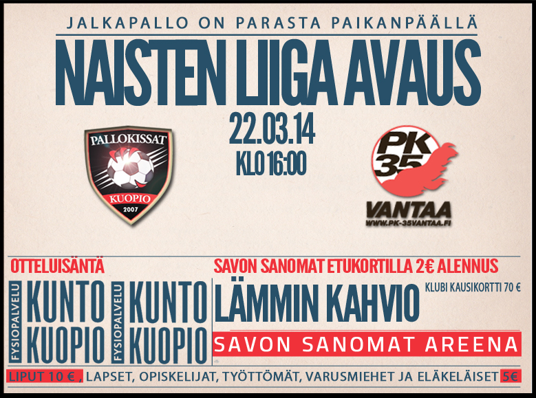Hieno avauskierroksen ottelu Pallokissoilta suosikkia vastaan Pallokissat sai vastaansa vahvan ja mestarisuosikkina pidetyn PK-35 Vantaalta. Kaunissa noin viiden asteen auringonpaisteessa pelattu ottelu sisälsi paljon elementtejä joista kissalauma voi olla ylpeä. Pallokissojen laajassa ringissä on useita pitkäaikaispoissaoloja ja lisää jobin postia tuli viikolla, mutta tästä huolimatta joukkue taisteli todella mallikkaasti valmennuksen ohjeiden mukaisesti. Eikä voittokaan olisi missään nimessä ollut vääryys. Ottelun alku oli tunnustelevaa ja vaikka vantaalaiset piti palloa enemmän oli Pallokissat hyvin pelissä mukana. Yhdellätoista minuutilla Pallokissat hyökkää ja riistää uudelleen pallon josta Signy Aarna jatkaa Anni-Maija Kauppilalla. Kauppila ohittää yhden puolustajan ja lataa kuudeltatoista pallon kauniisti maaliin. Pelin juoni jatkui tästä aika samanlaisena kuin alkukin. Muutaman kerran oli kuopiolaiset karata PK-35 puolustukselta kunnes 22 minuutilla Kauppila syöttää Aarna joka puolittain pääsee etenemää ja laukoo tarkasti 2-0 Kissoille. Ennen puoliaikaa vierasjoukkueella on pari hyvä paikkaa tulla tasoihin siinä onnistumatta. Toisen puoliajan alussa Kissoilla on paikat ratkaista ottelu mutta Vantaan maalivahti torjuu muutaman hyvän yrityksen. 72 minuutilla vihdoin vierasjoukkue tasoittaa kun oikealta tullut keskitys menee koko puolustuksen läpi ja vaihdosta kentälle tullut Tia Painilainen laittaa pallon varmasti verkkoon. Tässä vaiheessa Kissat pääsee taas paremmin peliin mukaan ja saa myös vaarallisia hyökkäyksiä aikaiseksi. Ratkaiseva ja tasoittava tilanne puhutti paljon pelin jälkeenkin. Pallokissojen kapteeni Kata Naumanen loukkaantuu kuudentoista sisällä ja jää makaamaan kentän pintaan. Pallojen tavoittelutilanteessa useampi vantaalainen ja kuopiolainen nyhjäävät pallon kanssa. Tuomari viheltää pelin poikki ja alkaa loukkaantuneen hoivaaminen. Yllättäen peli jatkuu tästä epäsuoralla vapaaporkulla vantaalaisille noin 10 metrin päästä maalista. Vapaapotkun syyksi selvisi pelin jälkeen vaarallinen peli. Nokso-Koivisto laittoi pallon maaliin. Tämän jälkeen Pallokissat oli lähellä ratkaista ottelun pelaamalla. Signy Aarna antaa takaviistosyötön josta Kauppila sijoittaa pallon. Pallo osuu ylärimaan ja tolpaan mutta kimpoaa harmiksi poispäin kentälle. Ottelu päättyy näin tasatulokseen. Ottelussa pallonhallinta oli Vantaalla mutta todellisia maalipaikkoja oli ehkä sittenkin Pallokissoilla enemmän. Ottelussa oli paljon onnistujia ja jääpusseille oli käytössä laajalla rintamalla. Joukkueen kapteenistoon kuulunut Neea Berg kommentoi ottelun jälkeen: "Kyllä harmittaa nyt kahden pisteen menetys, mutta kyllä se tästä kääntyy vielä hyväksi oloksi. Oli mukava pelata kun koko joukkue uskoi omaan pelitapaan ja näkee että voimme haastaa sarjassa kaikki joukkueet" Maalit: Veikkauspisteet: |
