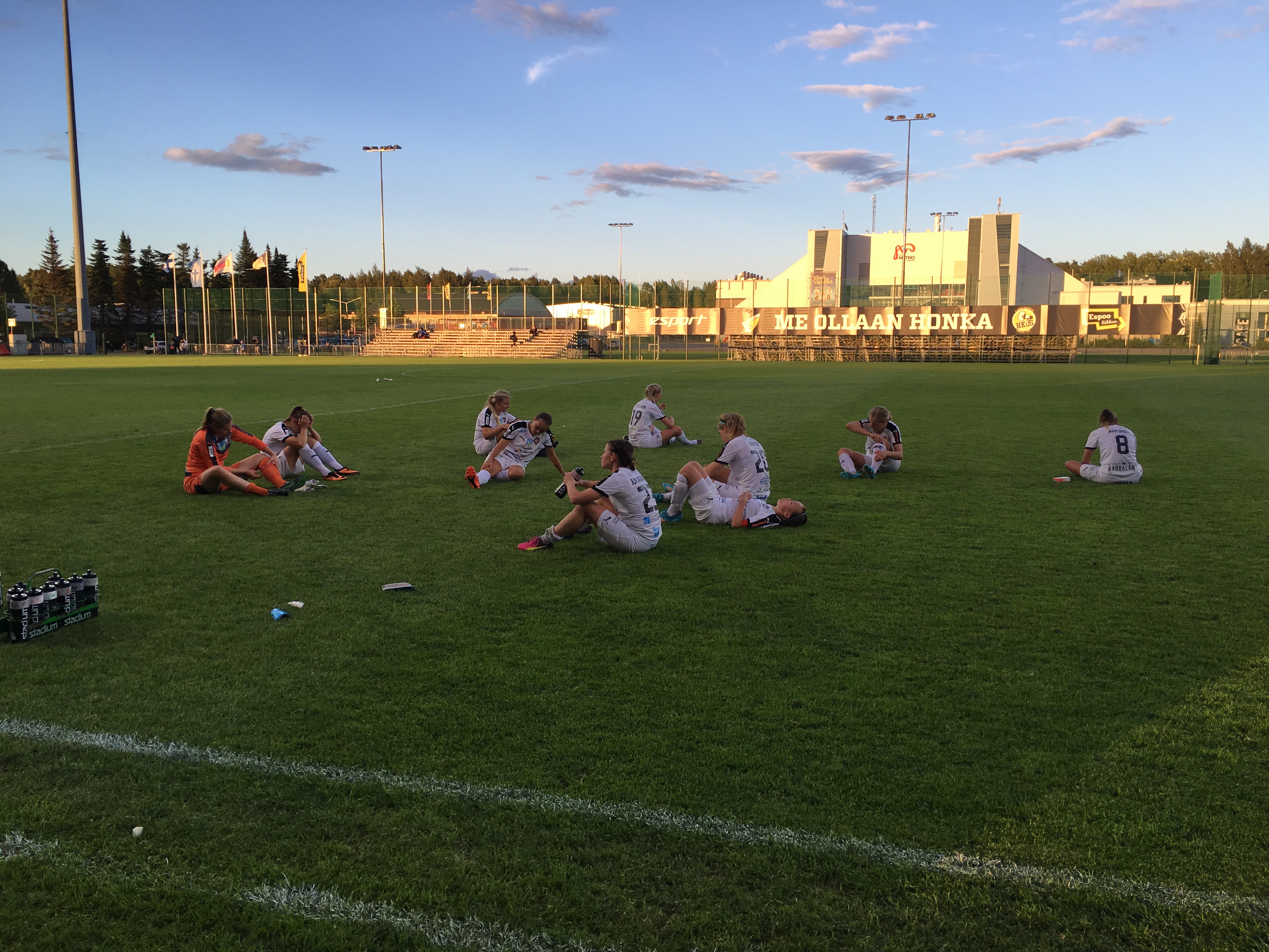 FC Honka voitti Respect Suomen Cupin välieräottelussa Pallokissat jatko-ottelun jälkeen 2-1 ja eteni näin kolmannen kerran peräkkäin finaaliin. Pallokissojen 0-1 maalin teki Signy Aarna. Välierä jatkoi joukkueiden välistä tasaisten otteluiden sarjaa. Molemmat joukkueet olivat vaihtaneet lauantain ottelun avauskokoonpanosta kolme kenttäpelaajaa ja hakivat näin lisävirtaa ja kuormituksen tasaamista. Ottelun ensimmäinen puoliaika oli enemmän Pallokissojen. FC Hongalla oli pari puolittaista maalipaikkaa, mutta tilanteet eivät aiheuttaneet suuria vaikeuksia Pallokissojen maalivahti Pauliina Tähtiselle. FC Hongan maalivahti Paula Myllyoja joutui puolestaan venymään pari kertaa. Näiden lisäksi Pallokissat laukoivat kaksi kertaa tolppaan. Ensin Tiia Savolainen oman syötönkatkonsa jälkeen vasemmallaan noin 16 metristä ja myöhemmin Erika Winter noin 25 metristä sivuvapaapotkun jälkitilanteessa. Pallokissojen 1-0 maali tulipuolen tunnin kohdalla. Keskialueen pallonriiston jälkeen topparina pelannut Iida Laakkonen löytää keskeltä kapteeni Neea Bergin, joka laittaa Signy Aarnan linjan taakse puolittaiseen läpiajoon. Ensimmäinen yritys vielä kilpistyy honkapelaajiin, mutta kakkospallon Signy toimittaa itse verkkoon. Minuuttia myöhemmin Signy saa toisen yrityksen, kun Erika Winter heittää sivurajan Anni-Maija Kauppilalle, joka nostaa linjan taakse, mutta Signyn nostoyritys yli vastaantulleen maalivahdin jää vajaaksi. Toisen puoliajan alku oli taas puolestaan vahvasti FC Hongan. Pallokissat ei saanut omaa pallollista peliä ollenkaan kulkemaan ja Honka loi painetta. 48 minuutilla Pauliina Tähtinen tekee upean lähitorjunnan, mutta viisi minuuttia myöhemmin Marianna Tolvanen pääsee kääntymään 16 rajalla ja ohittaa Tähtisen tasoittaen pelin 1-1. Tämänkin jälkeen hongan paine jatkuu ja johtaa mm. useisiin kulmapotkuihin. Aivan varsinaisen peliajan lopulla Pallokissat onnistuu luomaan painetta honkamaalille, mutta ilman tulosta. Vastaavasti hongan Sini Vehviläinen laukoi kahteenkin otteeseen Pallokissojen maalin ylärimaan. Ottelun voittomaali syntyi 97 minuutilla. FC Honka nosti pallon kissojen linjan taakse ja pienen epäröinnin seurauksena Sini Vehviläinen ehtii ensimmäisenä palloon ja tökkää voittomaaliksi jääneen 2-1 osuman. Jatko-ottelun toiselle puoliajalle Pallokissat vaihtoi ryhmitystä hyökkäävämmäksi ja yritti paineistaa hongan alakertaa pitkillä palloilla. Pientä painetta hongan päätyyn onnistuttiin luomaankin, mutta todelliset vaaranpaikat jäivät syntymättä. -Meillä oli ensimmäisellä puoliajalla omat paikkamme ratkaista peli, mutta kuten niin usein pallopeleissä, jos et onnistu omista paikoista, niin vastustajalle siunautuu omat paikkansa. Osa-alue, jossa tänään hävisimme FC Hongalle oli kaksinkamppailut ja ns. kakkospallojen voittaminen. Vaikka tämä saattaa kuulostaa katkeralta hävinneen joukkueen valittamiselta, niin sellainen kuva jäi ettei lauantaina eikä tänään kummankaan joukkueen pelaajat tienneet mitä kentällä saa tehdä ja mitä ei. Pettynyt päävalmentaja Ollipekka Ojala. |