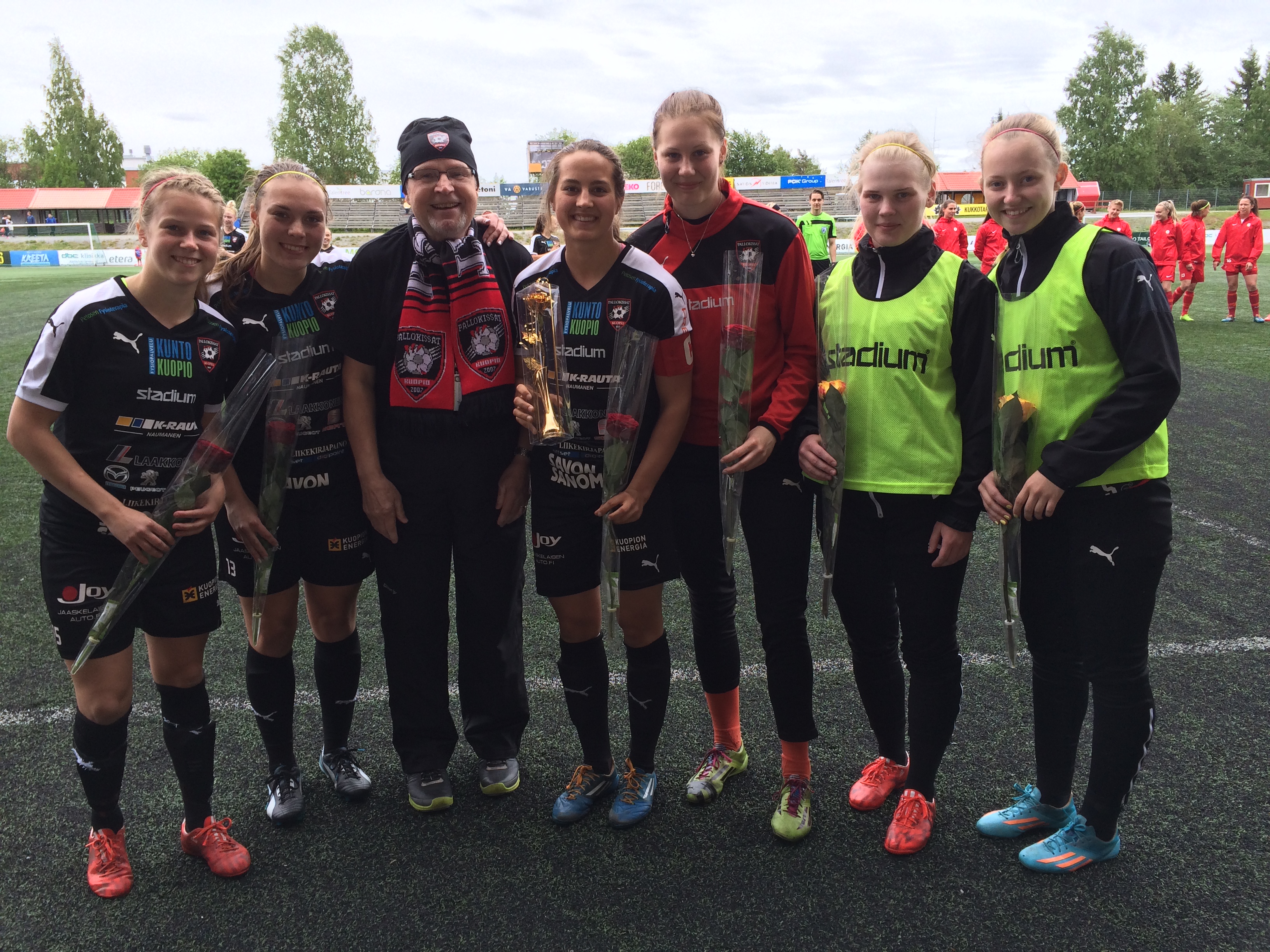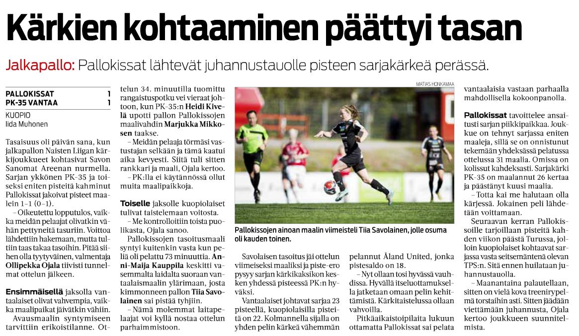 Pallokissat – PK-35 Vantaa 1-1 (0-1) Naisten Liigan kärkikamppailu päättyi samaan 1-1 tulokseen kuin keväällä pelattu Suomen Cupin puolivälierä. Ottelu olikin aika samanlainen kuin kevään kohtaaminen ja pistejakoa voidaan pitää oikeutettuna lopputuloksena. Molemmista joukkueista näki, että vastustajan vahvuudet tiedettiin, se näkyikin vähäisinä maalipaikkoina. Pelaaminen oli molemmin puolin aika tarkkaa ja kärkiottelulle tyypillisesti virheitä vältettiin. Ottelun ensimmäinen jakso oli lievästi vieraitten. Se piti palloa varmasti omalla puoliskollaan, mutta pystyi kuitenkin harvoin rikkomaan Pallokissojen puolustusmuotoa. Parhaat paikat syntyivät Pallokissoille ja niistä paras oli Anttu Kauppilan vapaapotku, joka kuitenkin painui yläriman kautta yli. Vierasjoukkue siirtyi kuitenkin johtoon, kun Heidi Kivelä toimitti rangaistuspotkun kotijoukkueen maaliin. Toisella jaksolla pallollinen pelaaminen tasottui ja kotijoukkue paransi omaa hyökkäyspelaamistaan. Täysin ansaittu tasoitusmaali syntyi ottelun 73. minuutilla. Riiston jälkeen Kauppila nousi vasemmalta laidalta nopeaan vastahyökkäykseen, harhautti PK pelaajan ja keskitti vasemmalla jalallaan. Keskitys osui ylärimaan ja paluupallossa oli ensimmäisenä Tiia Savolainen, joka iski tasoituksen tyhjään maaliin. Kaiken kaikkiaan ottelu oli hyvä tasoinen, vaikka maalipaikoilla ei tänään herkuteltu. Lopputulokseksi kirjattiin siis 1-1. Päävalmentaja Ollipekka Ojala kommentoi ottelua:”Näkihän siinä, että molemmat tiesivät toisen vahvuudet. Silti kärkiottelun arvoinen 90-minuuttinen. Me ei päästetty vierasjoukkuetta pelaamaan meidän muodon sisään ja pidettiin ne hyvin pois maalipaikoilta. Toisaalta me ei tänään päästy kontrolloidusti linjan taakse ja liian monesti riiston jälkeen hätäiltiin ja menetettiin pallo. Emme pystyneet tarpeeksi rytmittämään omaa pallollista peliämme . Joukkue on kuitenkin kasvanut huimasti viime kauden vastaavista otteluista ja seuraavaksi on otettava se seuraava askel ja voitettava nämä ottelut.” Taas järkyttävän työmäärän keskikentällä uurastanut Neea Berg ” Heti pelin jälkeen oli pettynyt olo, mikä kertoo siitä että uskotaan omaan peliin ja pelitapaan. On kuitenkin muistettava, että kärkikamppailusta piste on hyvä saavutus ja erityisen ylpeä olen siitä, että pystyttiin nousemaan siihen 0-1 tappioasemasta” Pallokissat jää keskiviikkona ansaitulle Juhannus-tauolle ja jatkaa pelejään lauantaina 27.6 Turussa, kun vastaan asettuu alakanttiin kautensa aloittanut TPS. Seuraava kotiottelu on vasta 11.7 Ilvestä vastaan. ----------- Seuraa Pallokissoja myös Facebookissa ja Twitterissä.